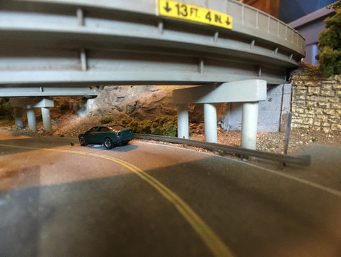 The layout is built using foam insulation board on a wood frame, with spray foam used to fill in gaps in the foam layers. The foam was carved and sanded to produce the various terrain, with rock castings and other scenery items, then glued on and blended in with lightweight wall spackle.