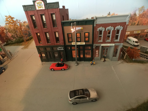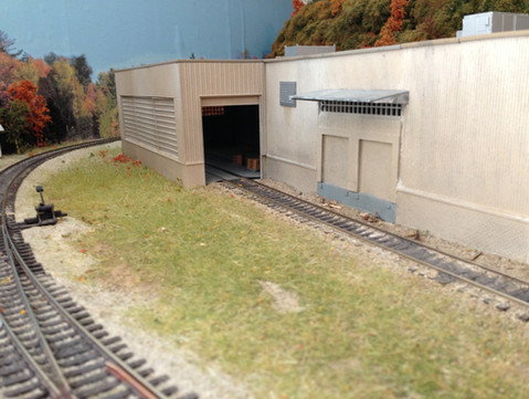 This 5x10 foot HO scale layout was built between 2005-2008 and was located in a corner of our upstairs game-room until about 2016. The layout featured three staging tracks on the backside of the layout and an industrial switching area on the front of the layout with five sidings serving five different industries: a distribution center, sand and gravel lot, food processing company, lumber yard and a grain elevator. The layout was wired for DCC operation and featured lighted buildings, some with detailed interiors, along with operating street and crossing lights.